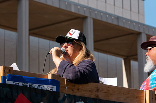 WGAW President Michele Mulroney addresses the crowd at the No Kings rally in downtown L.A. Photo by Moises Marquez.