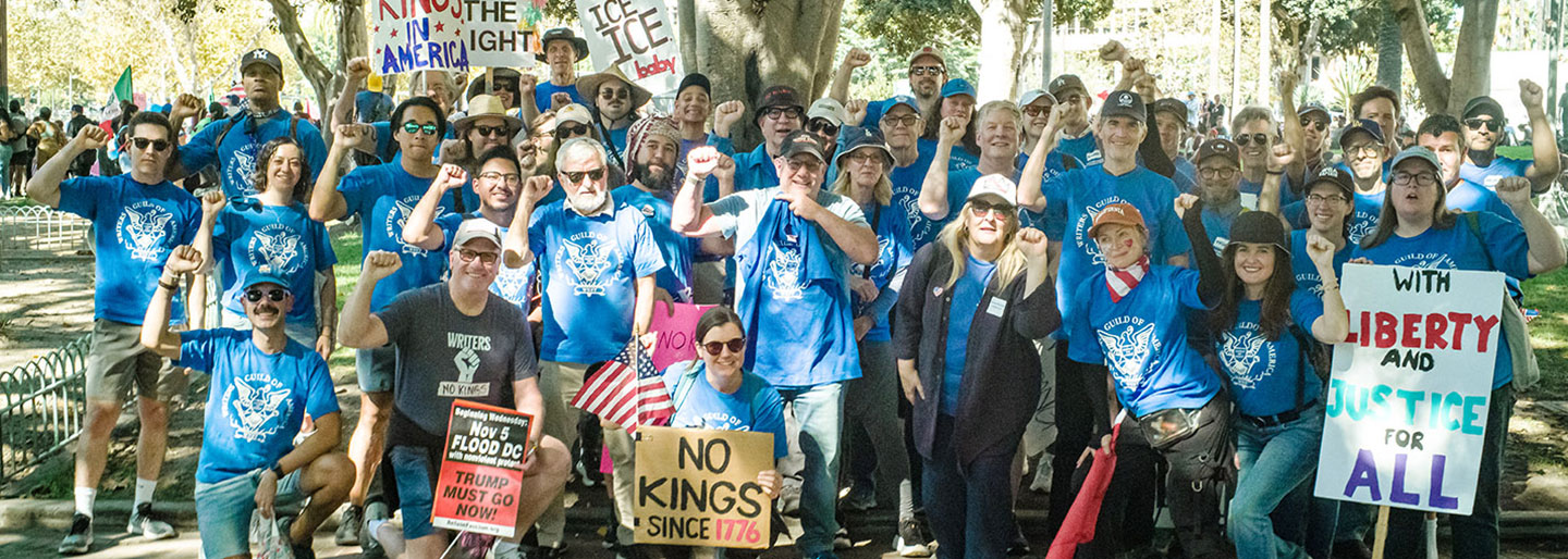 Sporting their telltale blue shirts and smartly-written protest signs, WGAW members joined the throngs of protestors at multiple L.A.-area No Kings demonstrations on October 18. Nearly 150 Guild members participated in actions in Santa Monica, Culver City, Studio City, and Downtown L.A.